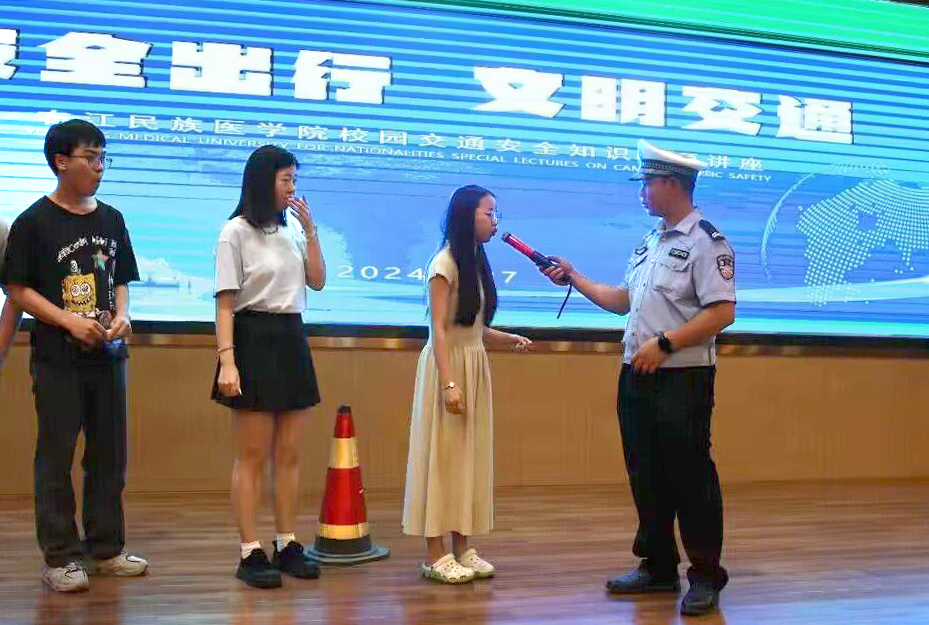 在互动环节,廖彬雅警官带领同学们现场体验了模拟酒精测试,同时积极回应师生们提出的各类交通问题,并分享了实用的预防和解决策略。通过聆听讲座,进一步增强了我校师生的交通安全意识,营造了安全、有序、和谐的校园交通环境。