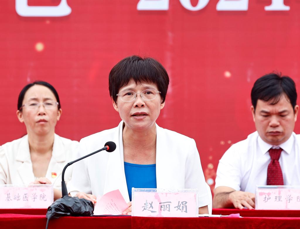 赵丽娟代表学校党政领导班子向出席大会的武警百色支队领导表示热烈的欢迎,向奋战在军训一线的全体教官表示衷心的感谢!向圆满完成各项军训任务的全体参训同学致以诚挚的问候。她希望同学们一是要坚定理想信念,厚植家国情怀。坚定“听党话、跟党走”的政治信念,勤学善思,刻苦钻研,精于医术,诚于人品,肩负起救死扶伤的重任,在涵养家国情怀、砥砺前行的过程中描绘亮丽的青春底色。二是要弘扬军训精神,锤炼品德修为。把军训成果转化为优良的校风、学风和班风,严格规范自身言行,自觉遵守校规校纪,养成良好的学习和行为习惯,成为红色基因和右医精神的优秀传承人,在右医成就最青春最美好的自己。三是要保持勤学奋进,勇于实践创新。把学习作为首要任务多读书,读好书,以“精医术、懂人文、有理想、能创新”的“大医”为目标,秉承“大医精诚”的校训,弘扬“艰苦奋斗、自强不息”的右医精神,做正青春、有志向、知奋进、担重担的“硬核青年”,在实现中华民族伟大复兴的中国梦的赛道上奋力奔跑,让青春在全面建设社会主义现代化国家的火热实践中绽放绚丽之花。