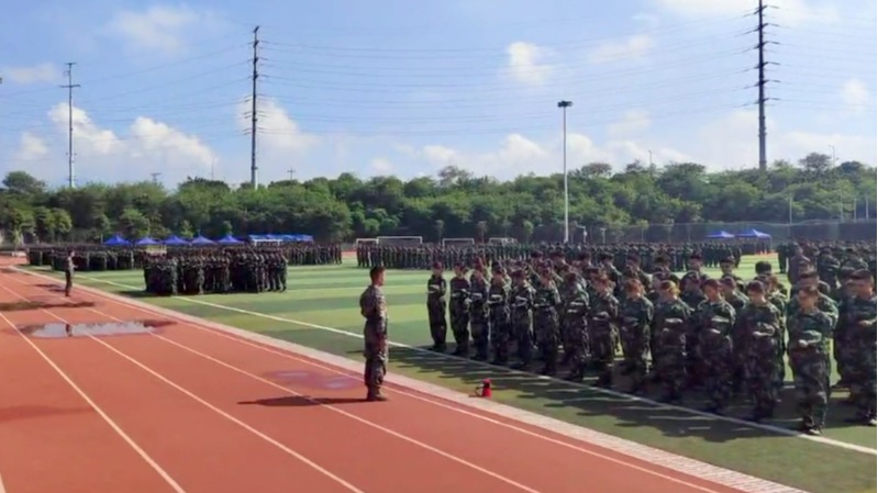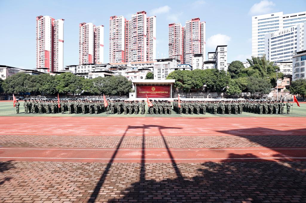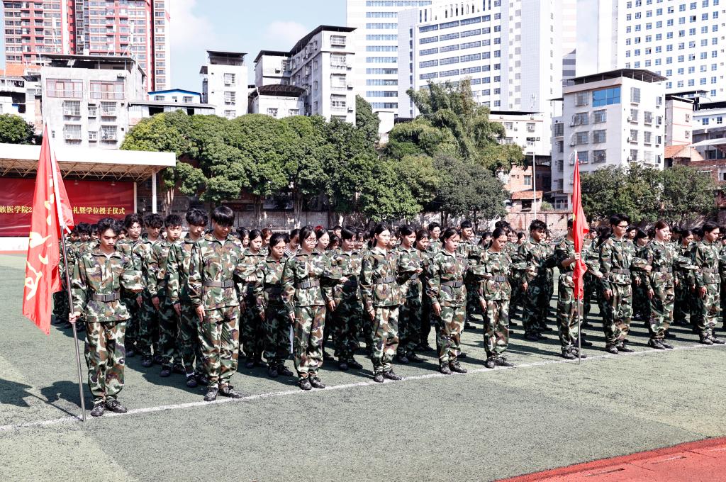 上午10时,在百城校区和百东校区的田径场上,2900余名身着迷彩服的新生与教官整齐列队。随着百色市防空警报声划破长空,全场脱帽低头,气氛凝重。默哀期间,操场上仅余风声与警报声回荡,不少学生紧抿嘴唇,眼中泛起泪光。