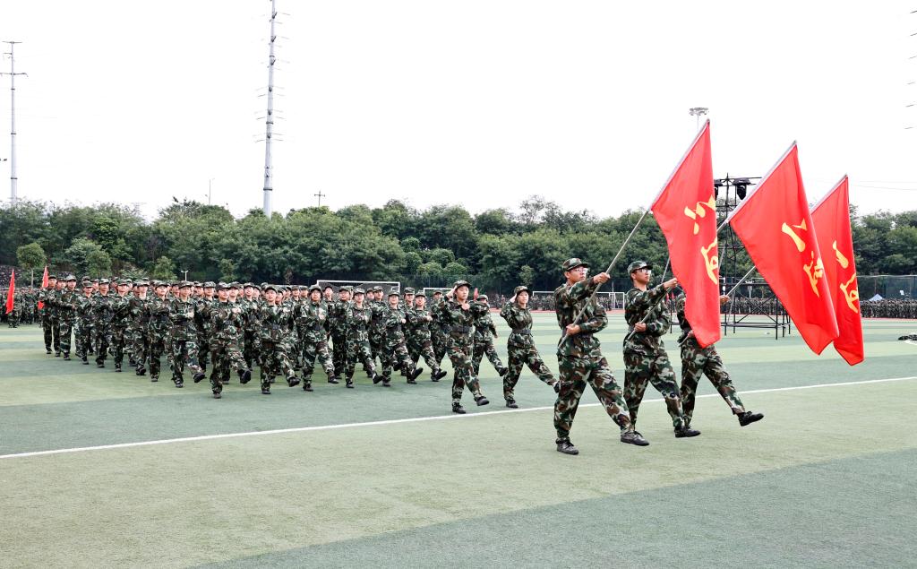 当天上午9时,典礼在庄严的国歌声中拉开帷幕,军训成果汇报展演正式开始。各连队方阵迈着铿锵有力的步伐依次走过主席台,接受检阅。在分列式的汇演中,各方队迈着铿锵有力的步伐通过主席台,步伐整齐划一,摆臂高度精准一致,每一步都踏得坚实有力;方阵口号响彻云霄,呐喊声饱含激情,尽显新生的蓬勃朝气与军人的钢铁意志。军体拳方阵动作一招一式彰显军人气魄;刺杀操方阵气势如虹,喊杀声震耳欲聋,弓步刺、马步刺等动作精准利落。新生们以饱满的热情、昂扬的斗志完成了各项展演科目,充分展现了14天军训的丰硕成果,自信展现着军事训练带来的蜕变与成长,赢得了现场师生的阵阵掌声。