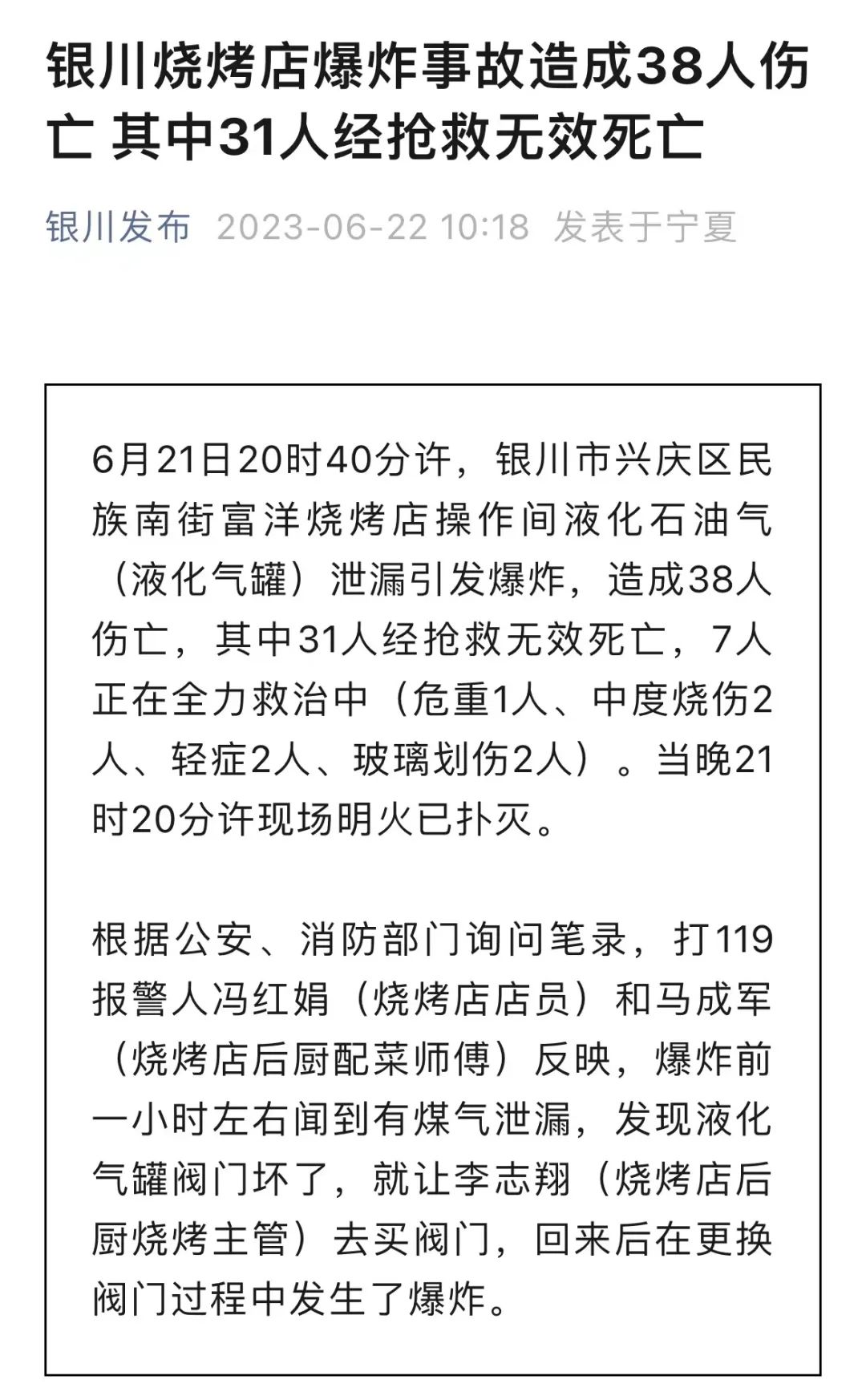 据“银川发布”消息,根据公安、消防部门询问笔录: